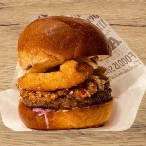 Brioche buci, BBQ aioli, jégsaláta, pankó morzsában sült ropogós csirkemell filé, cheddar sajt, bacon, hagymakarika, csemegeuborka, paradicsom